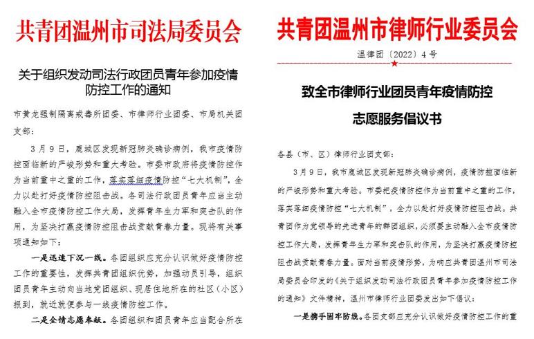 3月9日,我市鹿城区发现新冠肺炎确诊病例,疫情防控面临新的严峻形势和重大考验。根据市司法局团委通知要求,市律师行业团委积极响应号召,向全市青年律师发出《疫情防控志愿服务倡议书》,吹响律师行业青春战疫的“集结号”,发动青年律师主动融入全市疫情防控工作大局,积极了解防疫志愿服务需求,就近就便参与疫情防控工作。同时,主动发挥行业特点,做好疫情防控普法宣传工作,为坚决打赢疫情防控阻击战贡献青春力量。