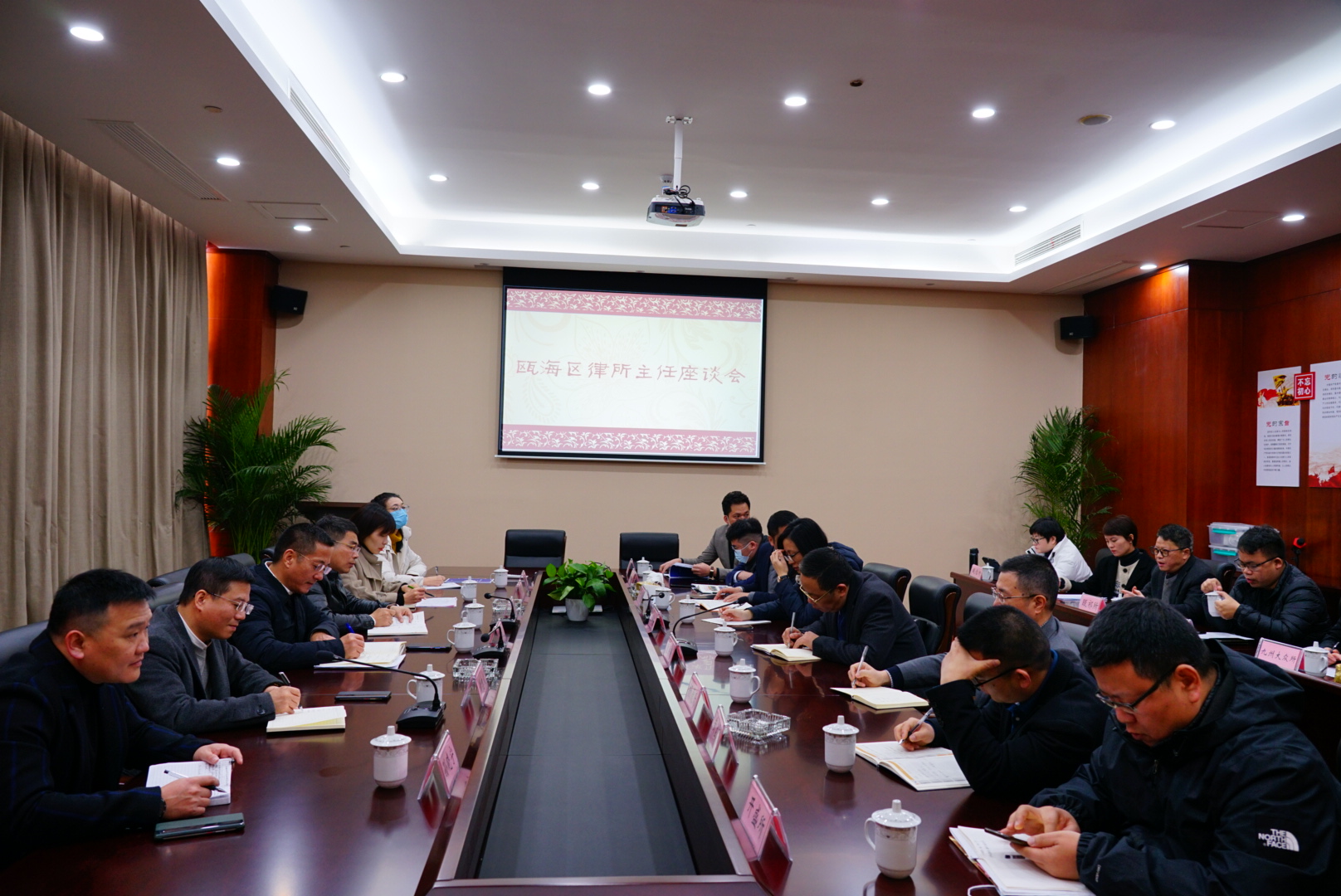 林向光副局长对瓯海区律师工作予以肯定,对几家律师事务所的汇报进行点评,认为近年来瓯海区高度重视律师行业,发展环境优越政策优惠,队伍发展迅速。各家律师事务所的发展思路清晰、举措实在。对大家在座谈中反馈的意见建议将逐步调研落实。他指出,律师行业作为法治建设一支重要力量,一是行业发展要始终坚持党的领导,坚定政治方向,讲大局、守规矩,加强党建工作,形成以党建促所建带队建局面。二是不断加强学习提升服务能力,研发优势法律服务产品,推进律师事务所专业化、特色化发展,更好的满足社会经济发展和人民群众日益增长的法律需求。三是进一步加强队伍建设,注重律师所文化建设,关注青年律师成长,做好“传帮带”。严管厚爱,加大职业道德与执业纪律警示教育力度,严守执业底线,以制度规范管理,增强律师事务所核心竞争力。