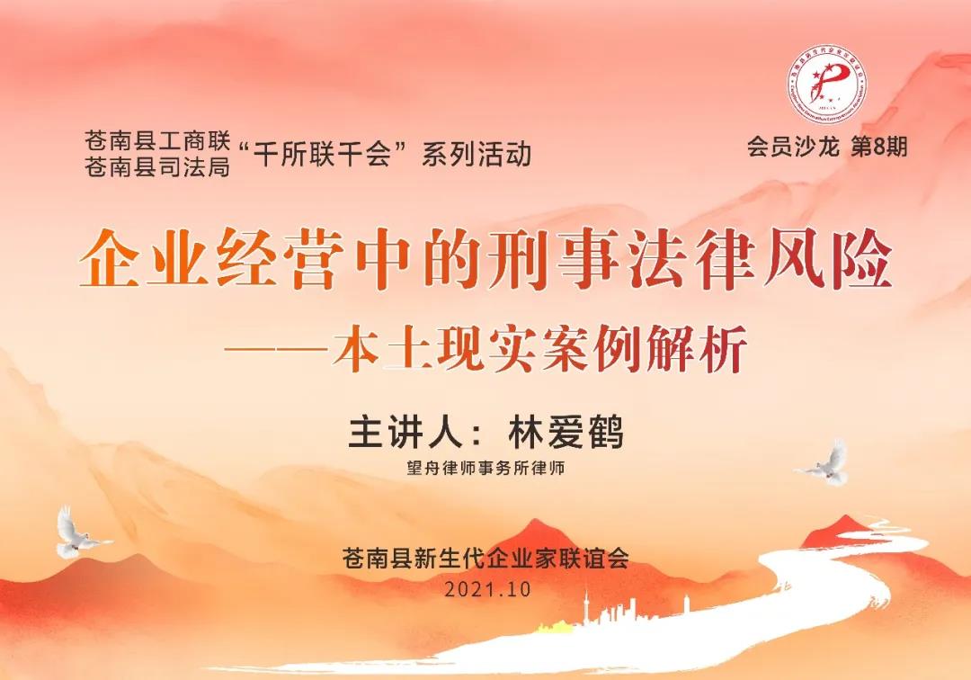 10月18日,苍南县新生代企业家联谊会在社会主义学院开展第八期会员沙龙活动。林爱鹤律师分享了企业在经营中遇到的刑事法律风险。