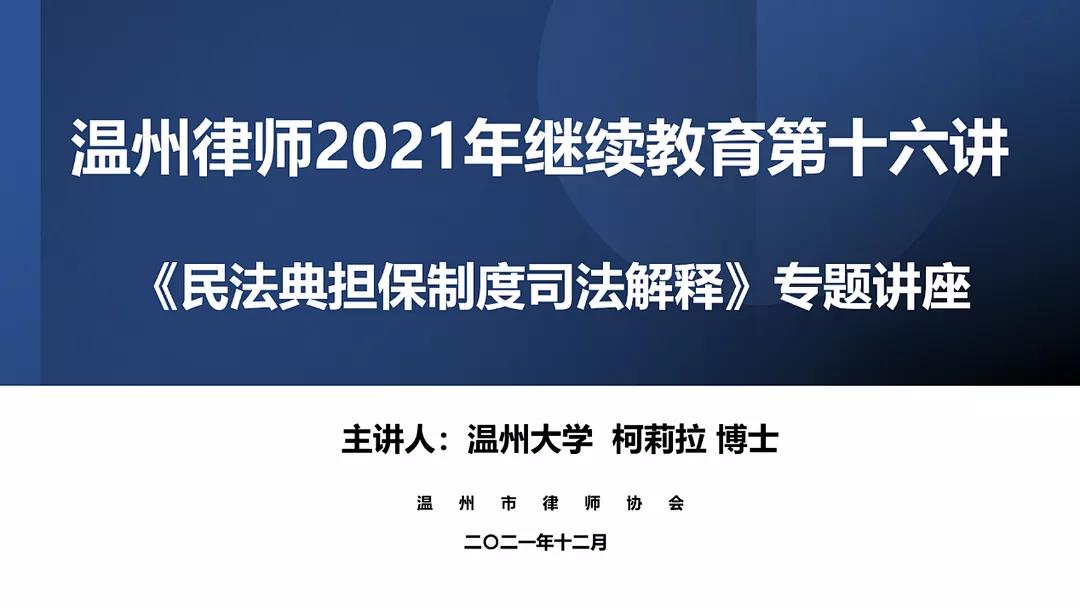 2021年12月18日,由温州律协主办,市律协民商事委员会承办的温州律师继续教育第十六讲——“民法典担保法司法解释”专题讲座顺利举办。因疫情防控,本次讲座采用在线方式举行。讲座邀请了温州大学法学院柯莉拉博士主讲,由民商事专业委员会副主任周大红律师主持,全市200余名律师在线参加培训。
