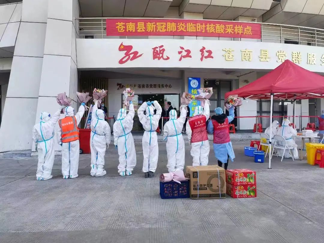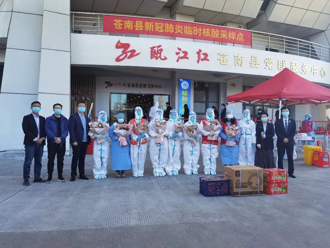 慰问组一行先后走访苍南动车站防疫执勤点、高速路口防疫执勤点和县体育馆核酸检测点等地。得知县体育馆核酸检测点的医用口罩紧缺,慰问组一行准备了800个N95医用口罩,为防疫工作贡献一份力量。