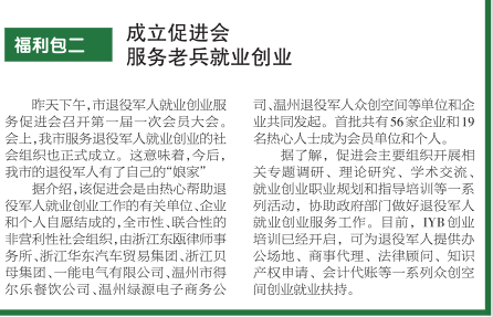 据介绍,该促进会是由热心帮助退役军人就业创业工作的有关单位、企业和个人自愿结成的,全市性、联合性的非营利性社会组织,由浙江东瓯律师事务所、浙江华东汽车贸易集团、浙江贝母集团、一能电气有限公司、温州市得尔乐餐饮公司、浙江绿源电子商务公司、温州退役军人众创空间等单位、企业共同发起。促进会主要组织开展相关专题调研、理论研究、学术交流、就业创业职业规划和指导培训等一系列活动,协助政府部门做好退役军人就业创业服务工作。首批共有65家企业和19名热心人士成为会员单位和个人。