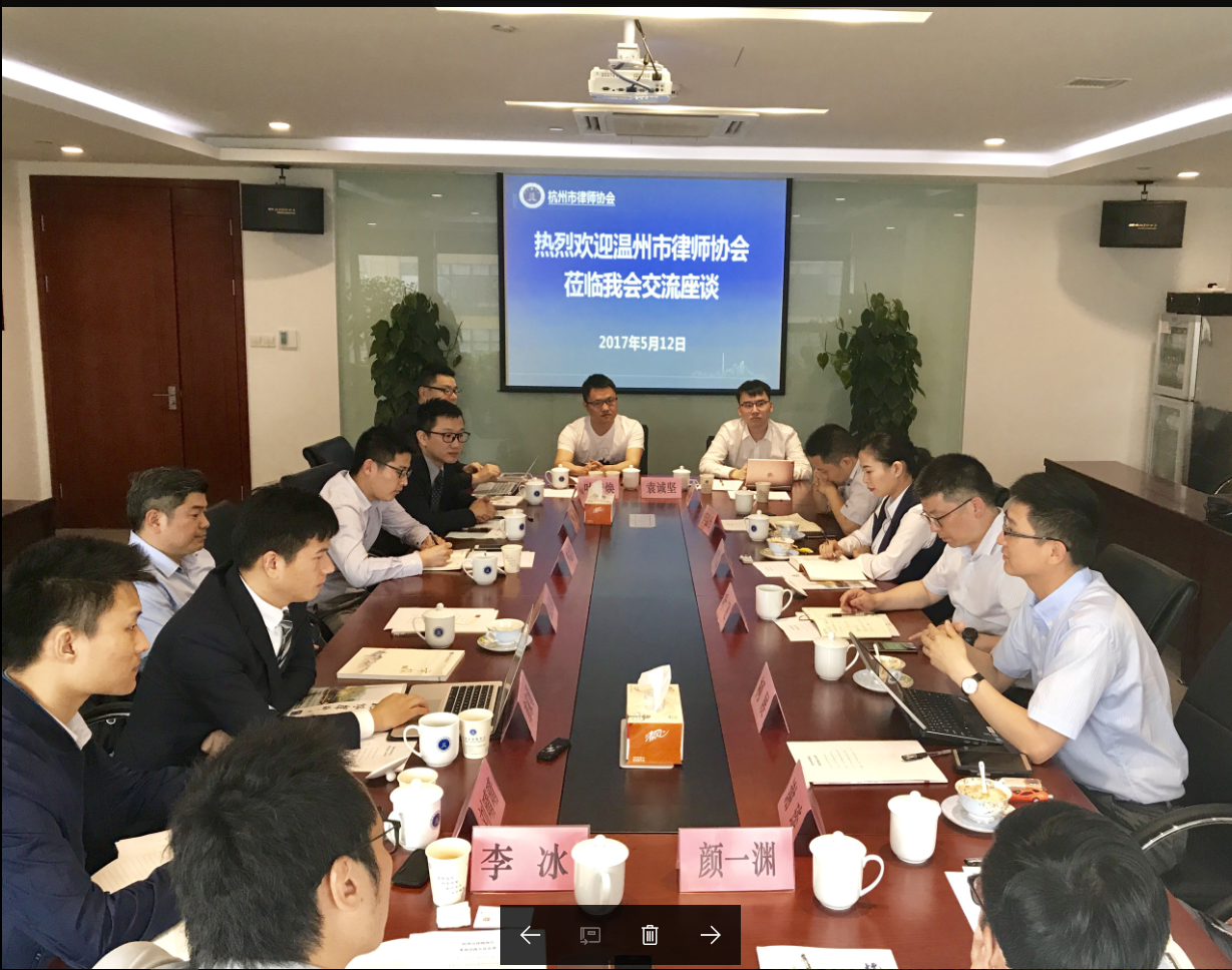 2017年5月12日下午,市律协青工委组织部分青年律师在副会长叶飞带领下赴杭州市律协考察交流,杭州市律协副会长徐宗新、团委副书记李益步、团委外联委员龚家勇、团委文体委员张宽等接待了温州律师一行,双方进行了友好交流。
