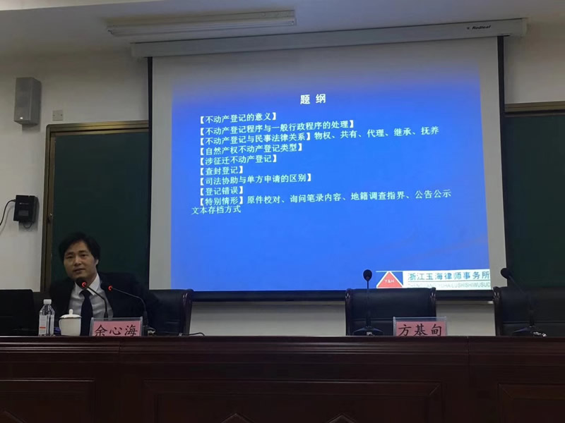 1月21日,浙江玉海律师事务所余心海律师应瑞安市国土资源局邀请,在瑞安城市学院为该局工作人员举办《法治语境下的不动产登记》法律知识讲座。