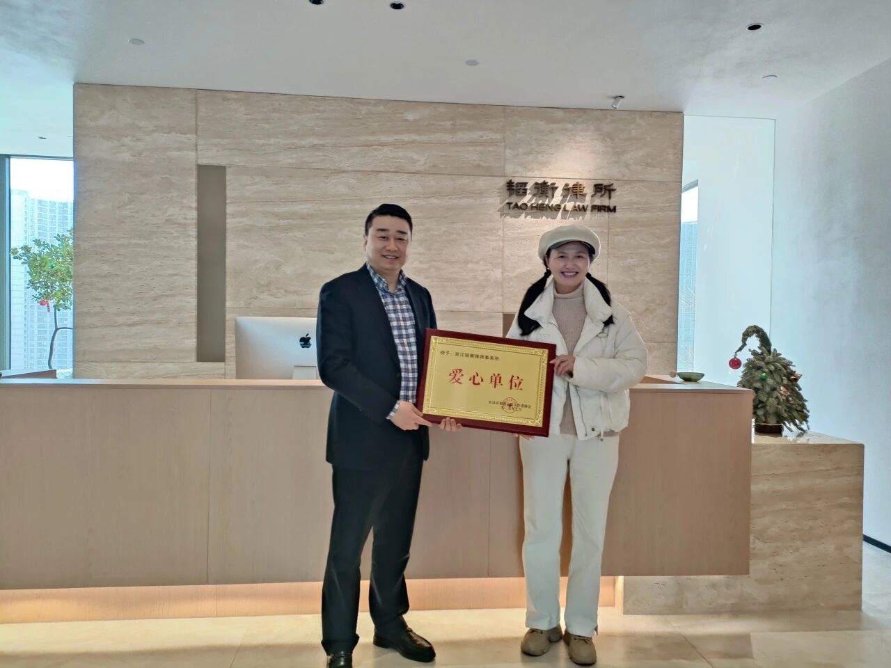 乐清市和谐志愿工作者协会向浙江韬衡律师事务所授予“爱心单位”牌匾